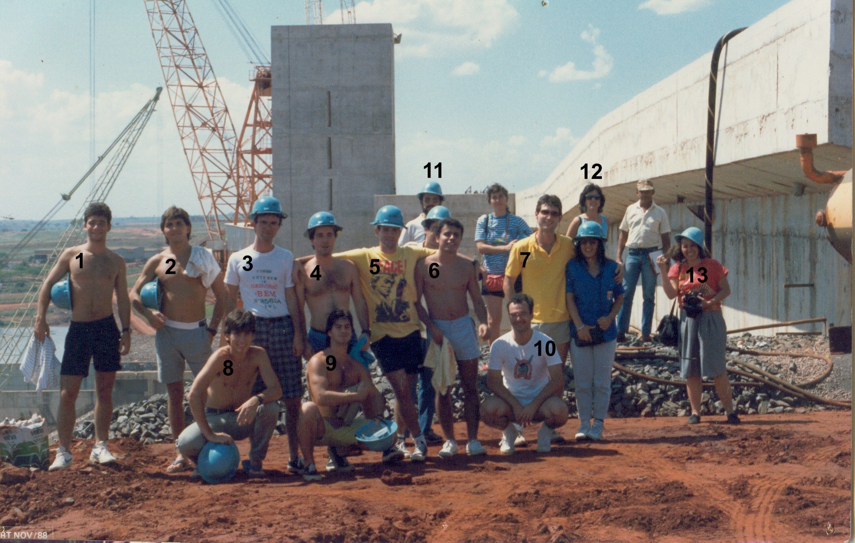 Visita às obras em Ilha Solteira - 1988. 1-Murilo Pagnano Ribeiro, 2-Flavio Sica de Campos, 3-José Luiz Melo (DZ), 4-Cláudio Dias (Barriga), 5-Julio Almeida Gomes (Julico), 6-Luiz Augusto Pereira Tavares (Vovô), 7-Carlos Cesar Buosi Righeti (C2), 8-Henrigque Vinicius Gandini Salto, 9-Valdir Antunes Filho (Valdivino), 10-Antonio Magno Lima Espeschit (Toni), 11-Prof. Hugo Passos Simão, 12-Profa. Iria Fernandes Vendrame, 13-Profa. Delma de Mattos Vidal. Minha memória não me permitui lembrar os nomes dos outros presentes na foto.