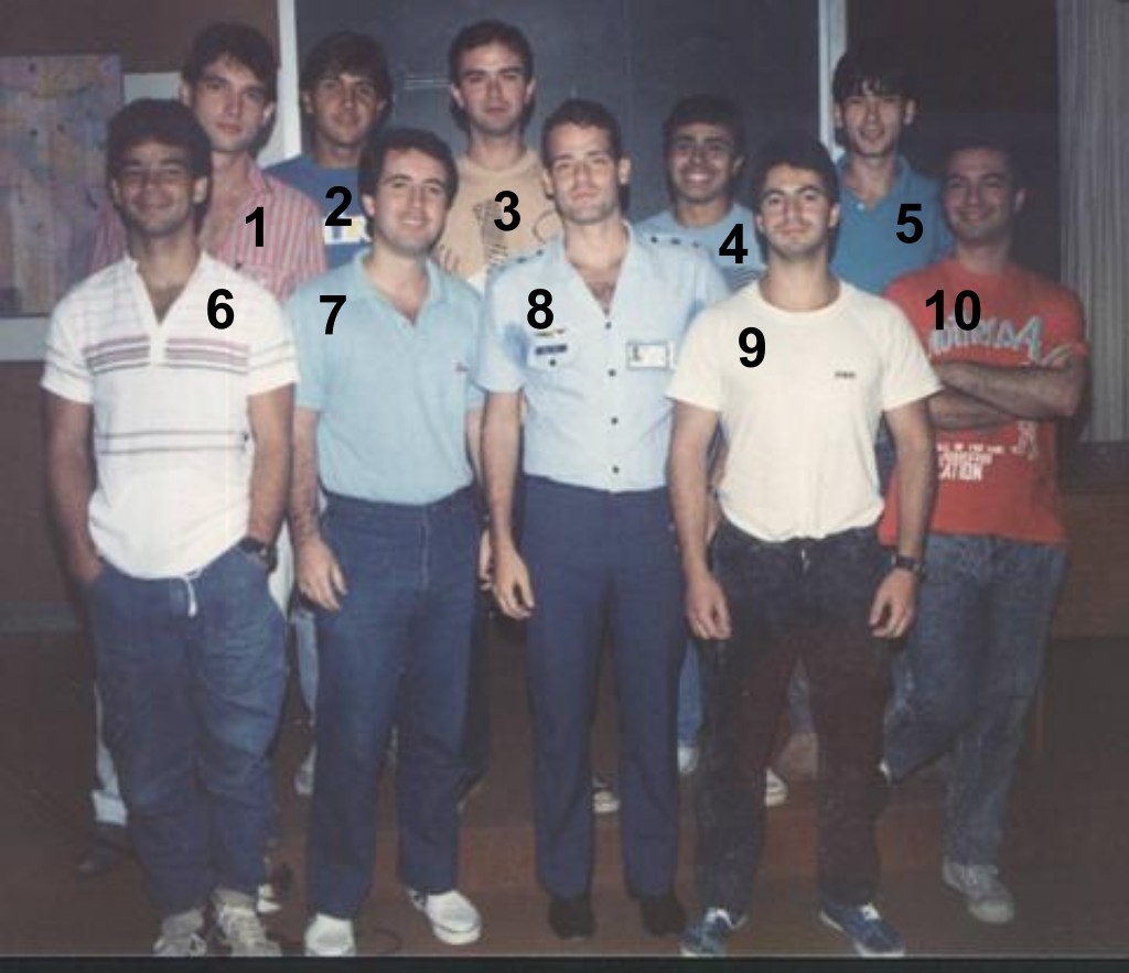 Da esquerda para a direita, podemos identificar os seguintes alunos: Inácio Bezerra Ponchet, Paulo Sergio Godoy Gaddini (Cap Av na época), Marcus Antonio Ferreira Araripe, Odilon Moulin de Asevêdo, Douglas Arthur Fernandes Júnior (Cap Av na época) e João Paulo Vieira Keller. Dois alunos dessa turma não puderam comparecer ao jantar: Alex de Magalhães Nogueira (1 Ten Eng na época) e Jair Lúcio Prados Ribeiro.