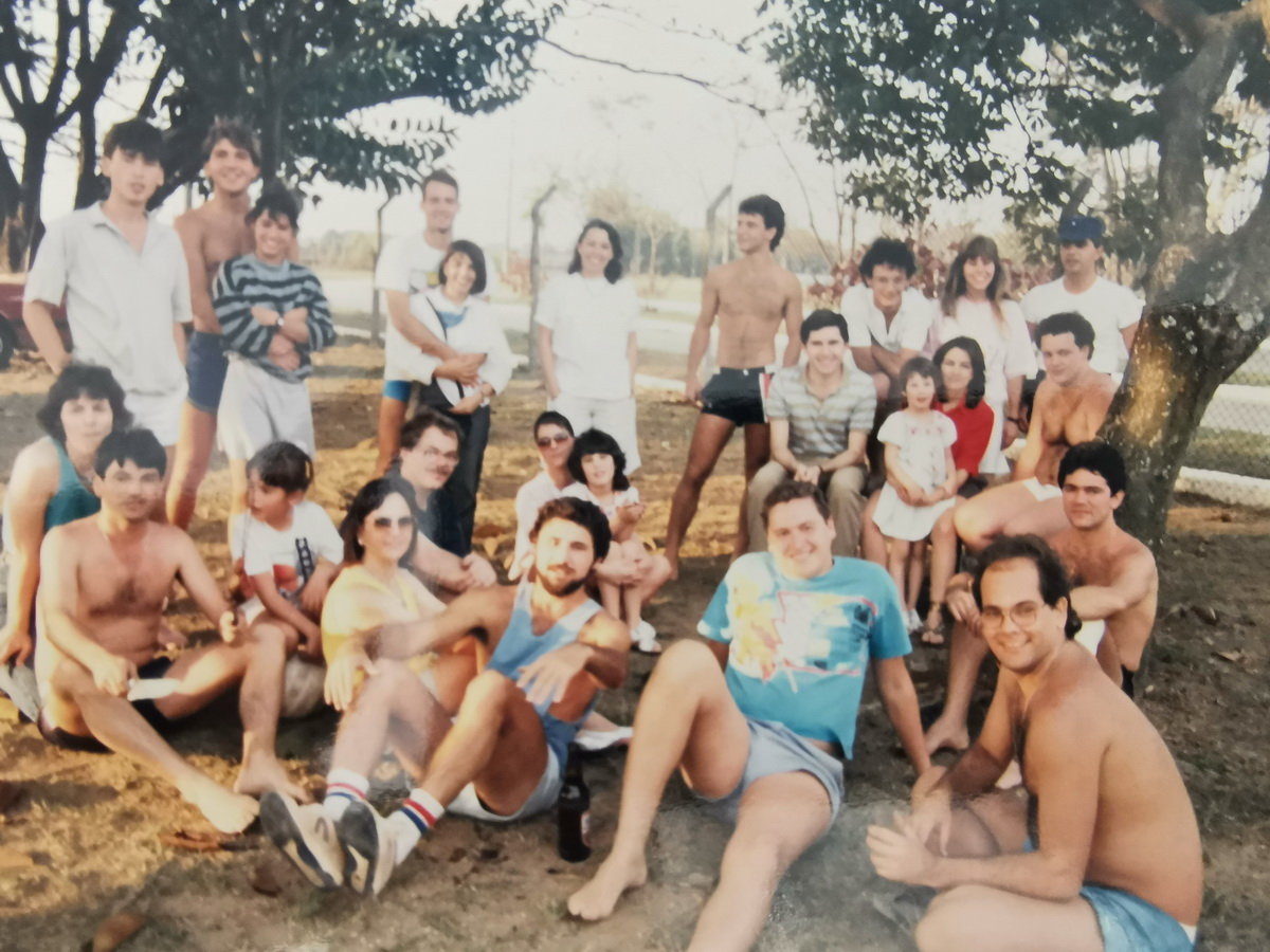 Churrasco de confraternização da Infra (?), circa 1987. Vários alunos da Infra87 e da Infra86 e alguns docentes: Müller (e esposa), Macário, Eliseu (e esposa), Flávio e, no centro, em pé, Delma. Prof. Cláudio Jorge não aparece nessa foto mas estava a esposa, com suas duas filhas. Técnico Giovanelli à esquerda, com família.
